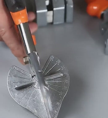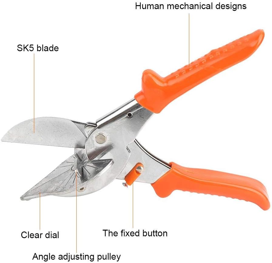 Sega troncatrice con marcature angolari e supporto regolabile per tagli precisi di rifiniture e altri materiali con angoli da 45° a 135° per creare giunzioni pulite.
