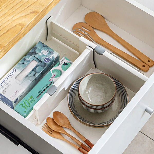 Adatti a cucina, bagno o camera da letto, i divisori sono regolabili da 28 a 45 cm per adattarsi alla maggior parte dei cassetti e personalizzare lo spazio.
