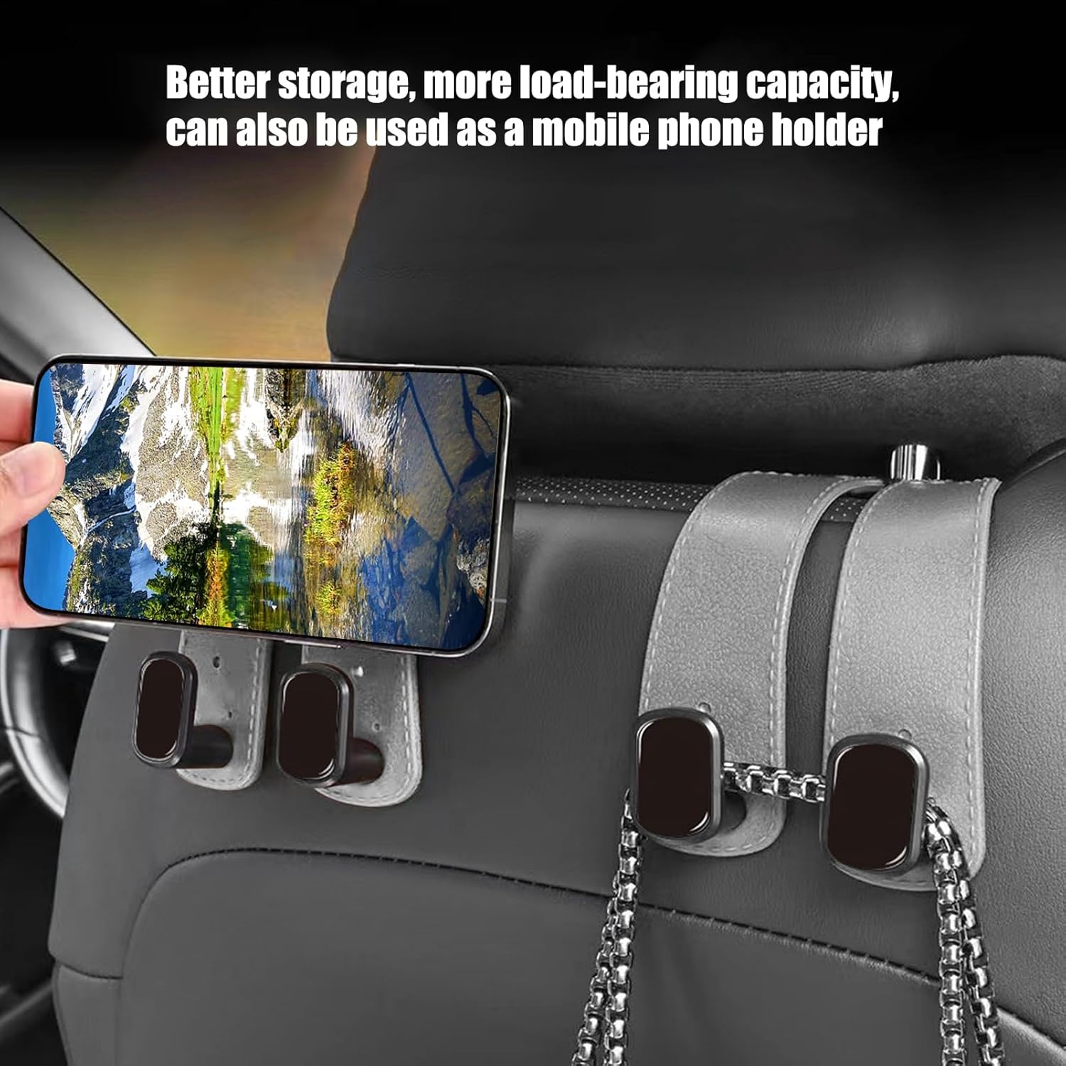 【Risparmia spazio in auto】 - Questo schienale multifunzionale per sedile auto con doppi ganci e supporto per telefono ti consente di appendere facilmente i bagagli e tenere il telefono a portata di mano. Mantieni la tua auto organizzata, libera da ingombri e rendi il tuo viaggio più facile senza alcuna pressione.