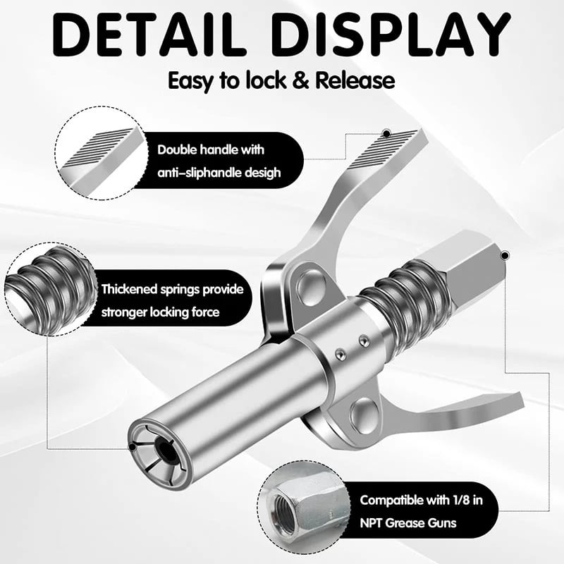 Funziona bene, facile da configurare sulla pistola per grasso e si aggancia agli accessori per grasso con buona precisione e senza perdite di grasso.