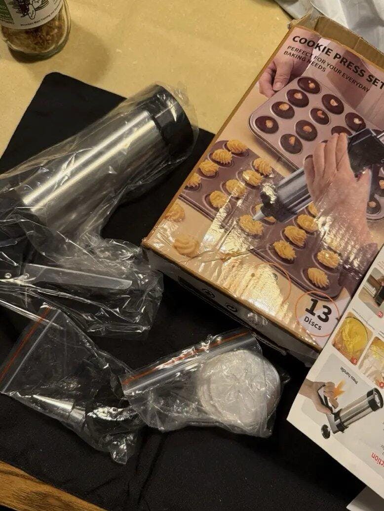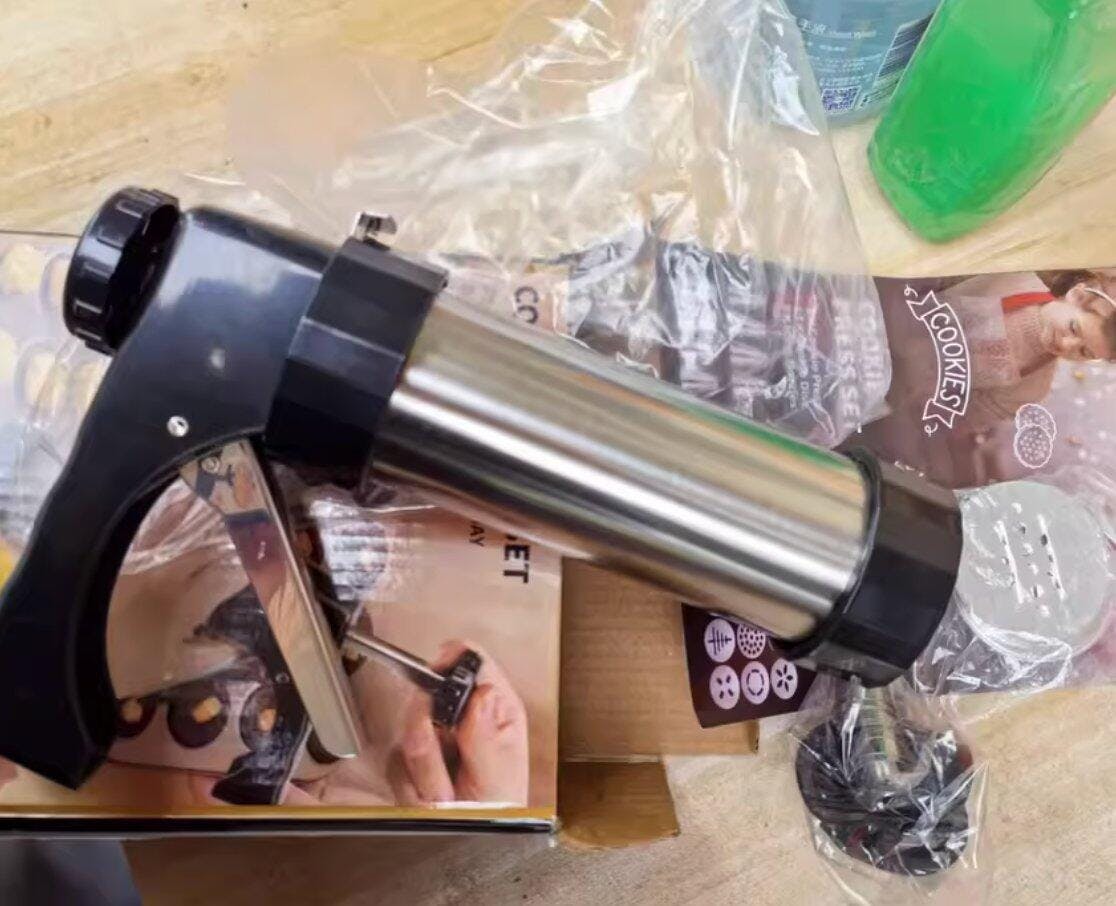 Include una pressa in acciaio inox di alta qualità, 13 dischi sagomati per biscotti e 8 beccucci per decorazioni di glassa.