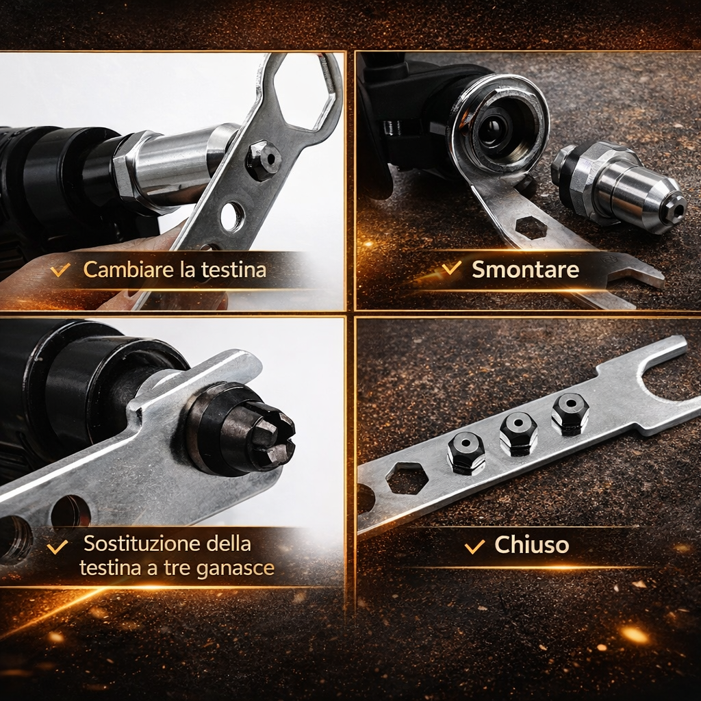 Basta collegare l'adattatore al trapano, ruotarlo in senso orario per inserire il rivetto e ruotarlo in senso antiorario per rimuoverlo rapidamente: un'operazione semplice per tutti gli utenti.
