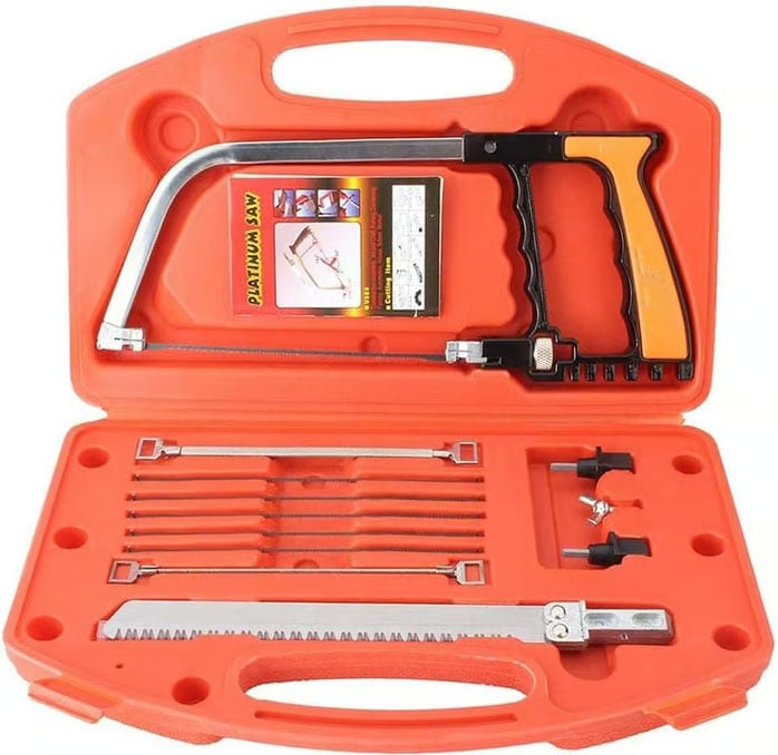 Include un seghetto ad arco, 5 lame in acciaio, 2 punte da trapano, 1 seghetto per legno e 2 lame diamantate.