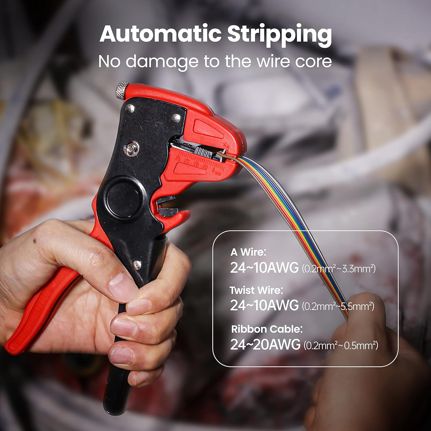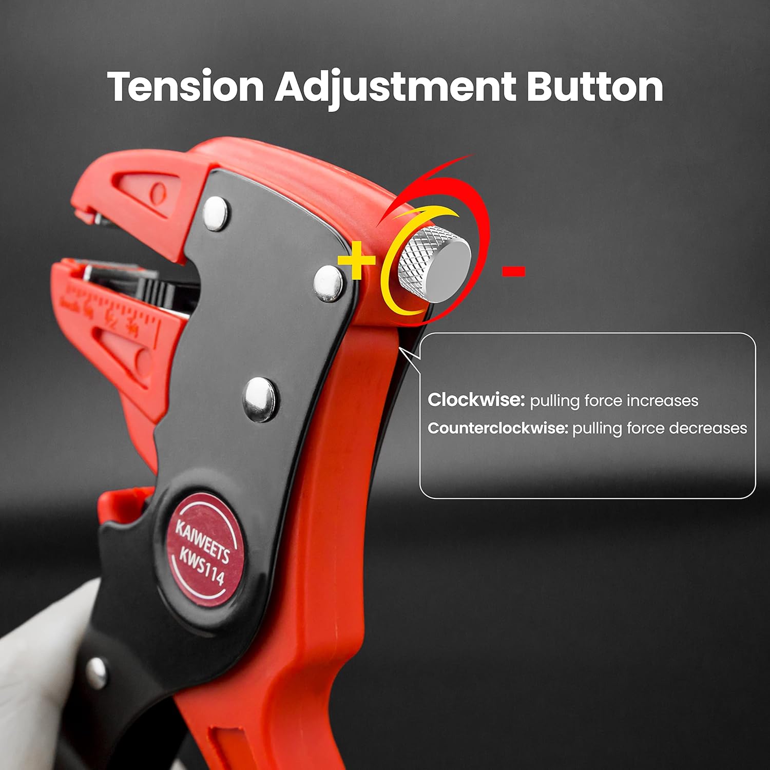 Spelafili autoregolante: il design della pinza spelafili a becco d'aquila può essere utilizzato in spazi ristretti. Fermo filo regolabile per regolare la lunghezza di spelatura (fino a 2,5 cm). Una manopola di regolazione della tensione per la forza di trazione in base ai diversi cavi può evitare che una forza di trazione eccessiva danneggi il nucleo di rame del cavo.