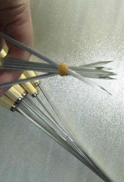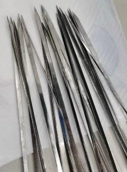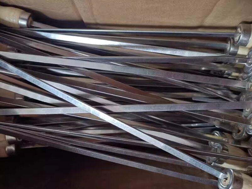 Gli spiedini sono in acciaio inossidabile, molto comodi per grigliare ali e sovracosce di pollo. Sono riutilizzabili e la lunghezza è perfetta per il mio piccolo forno. Il manico in legno è resistente al calore e antiscivolo, molto bello. Consiglierò sicuramente l'acquisto ai miei amici.