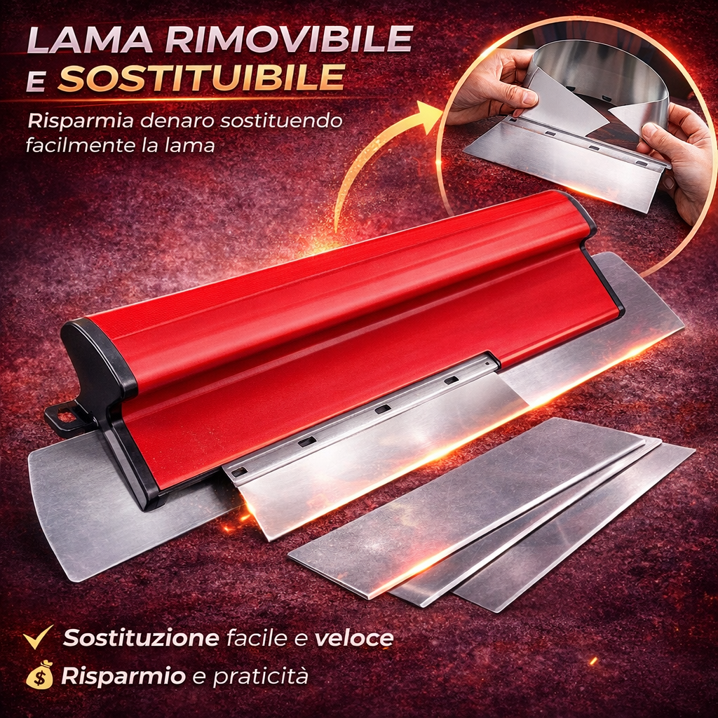 La lama è realizzata in acciaio inossidabile robusto, antipolvere e resistente alla corrosione. È lo strumento ideale per la nastratura dei pannelli in cartongesso.